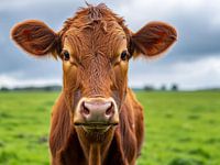 Dit ontroerende portret, "Jonge Koe op een Weelderige Weide", vangt de onschuld en nieuwsgierigheid van een jonge koe in een groene omgeving. De warme bruine tinten van de koe steken af tegen het frisse, weelderige groen van de weilanden, onder een bewolkte hemel die een rustieke en natuurlijke sfeer oproept. Haar grote, expressieve ogen en zachte vacht geven het beeld een gevoel van zachtheid en rust, perfect voor natuurliefhebbers en iedereen die de eenvoud en schoonheid van het plattelandsleven waardeert.