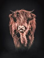 Deze foto vangt het ontroerende beeld van een kalf van een Schotse hooglander in al zijn majestueuze onschuld. Tegen een diepe zwarte achtergrond springt de zachte, vacht van het kalf direct in het oog, contrasterend met de duisternis om hem heen. Zijn grote, nieuwsgierige ogen stralen een gevoel van verwondering en ontdekking uit, terwijl zijn karakteristieke hoorns een belofte van kracht en trots suggereren.