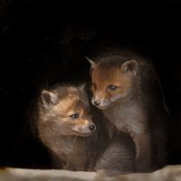 Een stel jonge vossen welpen bij de ingang van hun vossenhol. De pas geboren welpen die nog niet ver van het hol gaan in de periode dat ze net naar buiten komen.