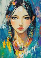 Jonge Vrouw Kleurexplosie - Dit vrouwen schilderij toont een portret van een jonge vrouw met expressieve grote ogen en een kleurrijke hoofdtooi, uitgevoerd in een dynamische, abstracte stijl met levendige streken en spatten van veelkleurige verf.