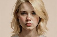 Ontdek de subtiele schoonheid van dit moderne kunstwerk, waar een jonge vrouw de essentie van ingetogen elegantie vastlegt. Haar blik is bedachtzaam en bijna tastbaar in haar introspectie. De lichtval accentueert haar blonde lokken en de zachte kleuren van haar gelaatstrekken, waardoor een harmonieus palet van warme tinten ontstaat.…