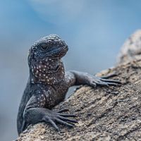 Deze jonge zeeleguaan kijkt nieuwsgierig over de rand van de pier op Isla Isabele een van de grotere Galapagos eilanden. Bijna alle diersoorten op de Galapagos hebben geen natuurlijke vijanden en kennen geen angst voor mensen