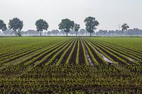 Scheuten van mais staan in voren die tot de horizon reiken in natte modderige grond