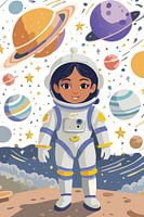 Deze betoverende illustratie toont een jonge astronaut in een modern ruimtepak, zelfverzekerd staand op het oppervlak van een buitenaards hemellichaam. Het pak is uitgevoerd in zachte grijstinten en wit, met opvallende blauwe en goudgele accenten op de mouwen, benen en taille. De astronaut straalt vreugde en avontuur uit en haar gezicht toont een warme glimlach onder de doorzichtige helm.
