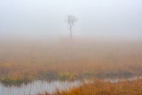Een jonge boom zonder bladeren in een mistig ven tijdens de herfst met water op de voorgrond in natuurgebied De Teut in Zonhoven (België).