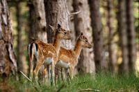 Deze schattige jonge damherten staan er prachtig bij in het bos.