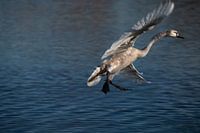 Een jonge grijze knobbelzwaan vliegt over blauw water in de natuur