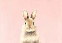 De foto toont een lichtbruin konijn dat frontaal voor een monochrome lichtroze achtergrond zit. Zijn zachte, pluizige vacht loopt in zachte kleurgradaties van lichtbeige op de oren en het gezicht naar een iets donkerder tint op het lichaam. De donkere, ronde ogen kijken recht vooruit. De kleine roze neus zit in het midden tussen de…