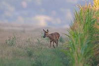 Jonge herten staan in een weide naast een maïsveld in de ochtend