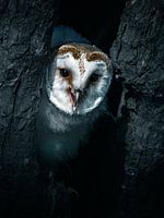Diep in de schaduw van de oude boom verschijnt een jonge kerkuil, nog donzig, maar met een blik die al eeuwen lijkt te kennen. Vanuit het hol kijkt hij de wereld in: nieuwsgierig en scherp. Hij lijkt even joehoe te komen zeggen en zich dan weer verschuild in de holte van de boom.