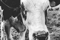 Niewsgierige koeien langs de slootkant. Jonge boerderij dieren grazen in de weiland van vers lentegras. Koe kijkt nieuwsgierig in de camera.