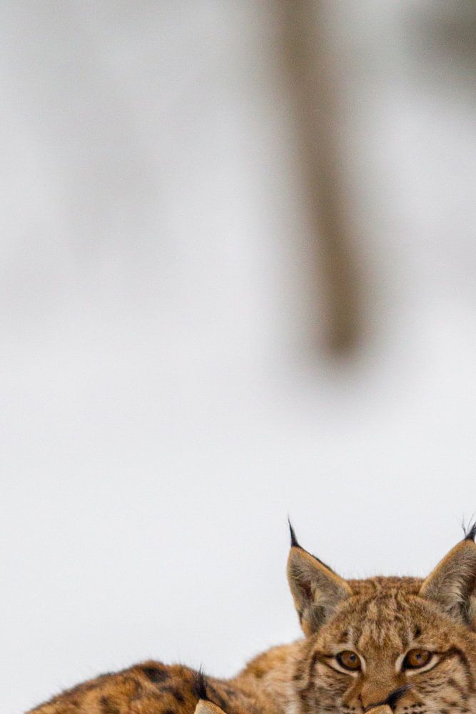 Twee jonge lynxen (Lynx lynxen) in de winter in het dierenverblijf in het Nationaal Park Beierse Woud, Duitsland.