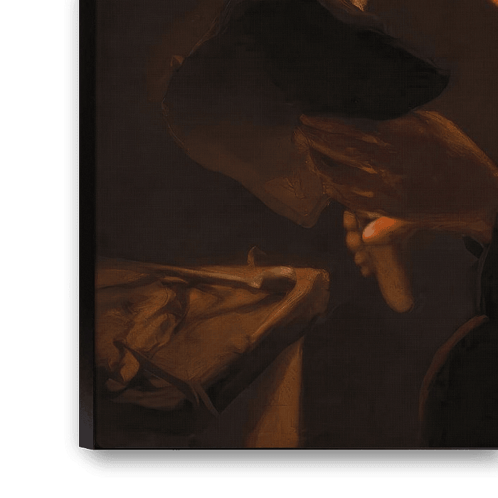 Jonge man bij kaarslicht van Christiaen Jansz-Dusart is een intiem en zeer sfeervol werk dat kenmerkend is voor de fascinatie van de Hollandse Gouden Eeuw voor licht en schaduw. Het schilderij legt een rustig, contemplatief moment vast, gericht op een jonge man die verdiept is in zijn lectuur.