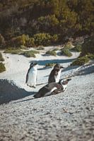Op deze foto zie je drie jonge pinguins op het Boulders beach strand in Zuid-Afrika. Ze genieten van de heerlijke zonnestralen.