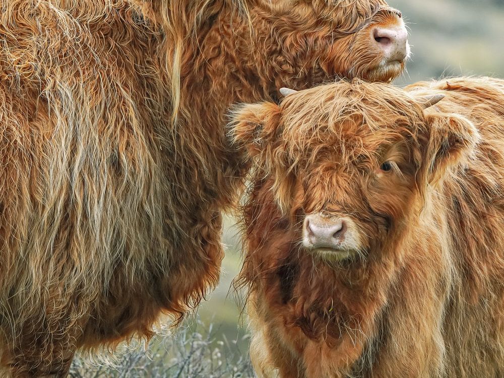 Schotse hooglander moeder met kalf in natuurgebied. Schotse hooglanders zijn op veel plaatsen in Nederland te bewonderen en zijn prachtige en vrij rustige dieren. Rond maart/april worden de eerste kalfjes geboren en dat is ieder jaar weer een prachtig gezicht.