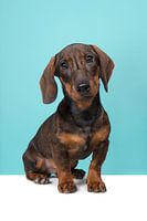 Jonge gladhaar teckel tegen een blauwe achtergrond