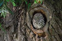 Uitgevlogen Velduil / Steenuil ( Athene noctua ) zittend in, kijkend uit natuurlijke boomholte.