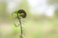 Jonge varen rolt zijn bladeren af in de lente, kopieer ruimte, geselecteerde focus