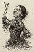 Het portret is opgebouwd uit vele losse zwarte draadjes, die het werk een speels karakter geven. Samen creëren ze een levendig beeld vol textuur en beweging. De Jurk toont subtiele dichtheden en de achtergrond van handgeschept papier geeft het werk een warme, natuurlijke basis.