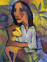 Deze vrouw zit met een kater of poes op schoot. Het huisdier is geel.