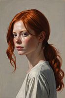 Dit tijdloze portret toont een jonge vrouw met vurig rood haar, die met haar tedere blik en zacht verlichte gelaatstrekken een gevoel van serene kalmte uitstraalt. De kunstenaar heeft elk detail met zorg vormgegeven, van de fijne sproetjes die speels over haar neus en wangen dansen tot de delicate stof van haar witte blouse. De eenvoudige achtergrond zorgt ervoor dat alle aandacht naar haar intrigerende uitstraling en subtiele expressie gaat. Dit kunstwerk is meer dan een beeltenis; het is een verhaal dat zonder woorden wordt verteld, perfect voor iedereen die op zoek is naar een stuk met zowel diepte als schoonheid.