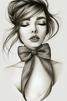 Haar haar is nonchalant gestyled, met losse lokken die speels rond haar gezicht vallen. Dit geeft de tekening een dynamisch en vloeiend karakter, alsof er een zachte bries door haar haar waait. Een opvallend element in het werk is de grote strik rond haar nek, die gedetailleerd is getekend met fijne lijnen die de textuur van de stof suggereren. Deze strik draagt bij aan de verfijnde en stijlvolle uitstraling van de vrouw.