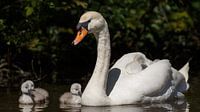 Een moeder zwaan en haar pas uit het ei gekomen jongen. De jonge zwaan zoeken geregeld de beschermende rug van hun moeder op om daar veilig te kunnen rusten of om gewoon een stukje mee te zwemmen.