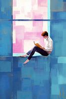 Jongen met Boek in Abstract - Op dit abstract schilderij zie je een jongen met een boek die rustig op een muurtje zit, omgeven door grote vlakken in koele blauwtinten en een zachte roze achtergrond die een sfeer van ontspanning uitstraalt.