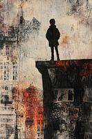 Jongen Hoog Boven Stad - Dit urban geïnspireerde abstracte schilderij toont een silhouet van een jongen bovenop een hoge richel, tegen een achtergrond van getextureerde gebouwen en rode herfsttinten; kleine beelden en knipsels zijn zichtbaar op de richel waarop hij staat.