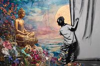 Dit betoverende kunstwerk verweeft de serene schoonheid van een gouden Boeddha met de levendige chaos van moderne street art. Terwijl de Boeddha in meditatie verzinkt, omringd door weelderige bloemen en etherische landschappen, onthult een jongen, geschilderd in een monochrome street art-stijl, een nieuwe dimensie van bewustzijn. Dit stuk nodigt de toeschouwer uit om de diepere lagen van spiritualiteit en hedendaagse kunst te verkennen, een perfecte harmonie van traditie en moderniteit die zowel thuis als in openbare ruimtes schittert.