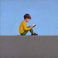 De felgele trui van de jongen steekt fel af tegen de gedempte tinten van de achtergrond en de richel, waardoor je aandacht wordt getrokken door zijn geconcentreerde vorm en het open boek dat hij in zijn handen houdt. Hier leeft het verhaal - niet alleen in de bladzijden van het boek, maar ook in zijn geabsorbeerde houding, het kantelen van zijn hoofd en de tijdloosheid van het moment.