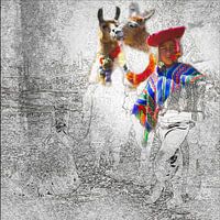 Over "Jongen met 2 lama's in Peru, gemengde techniek"