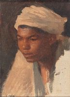Jongen met sjaal in verzadigd kleuren palet met groen en bruine accenten op de achtergrond. De kwast toets is duidelijk zichtbaar voor een extra vintage touch. Combineren met andere schilderijen uit dezelfde collectie met groentinten zorgt voor een prachtig vormgegeven geheel.