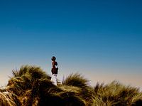 De foto die ik heb gemaakt laat een jong kind zien dat op een duin staat met zijn rug naar de camera. Het kind kijkt naar de heldere blauwe lucht, die een contrast vormt met de Duinen.