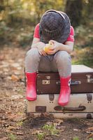 rode laarzen, appel, koffers, bos