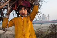 Jongen verzamelt kreupelhout tegenover de Taj Mahal in Agra India. Wout Kok One2expose