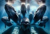 Boy Group" is een betoverende afbeelding van een groep potvissen, gevangen in één adembenemend moment van stilte onder de zee. De digitale kunst gemaakt met DALL-e, die kan worden gecategoriseerd als surrealisme, toont de majestueuze wezens in een bijna onwerkelijke formatie, die doet denken aan een zorgvuldig gechoreografeerde…