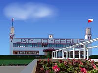 Het digitale kunstwerk “Jongeriuskantoor” toont een iconisch en historisch gebouw dat ooit dienstdeed als het hoofdkantoor van Jan Jongerius. Centraal in de afbeelding domineert de gevel met de opvallende rode letters “JAN JONGERIUS”, die direct de aandacht trekken en het erfgoed van het pand benadrukken. Boven deze naam prijkt een grote klok, met de wijzers op vijf voor tien, alsof de tijd daar stil lijkt te staan of een symbolisch moment markeert. Net boven de ingang van het gebouw is in bescheiden, kleinere letters het woord “Ford” zichtbaar, een verwijzing naar de relatie van Jongerius met het beroemde automerk.