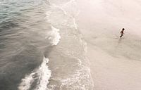 Vrolijk jongetje speelt met de golven op het strand in de branding.