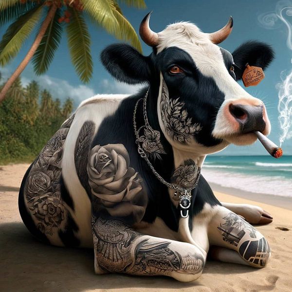 Jonkoe is een kunstwerk dat op een unieke en humoristische manier het alledaagse met het ongewone combineert. Deze tattooed koe, liggend op een tropisch strand met een joint in haar mond, brengt niet alleen een glimlach op je gezicht,…