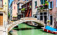 Een van de vele bruggetjes in Venetië, de intense kleuren geven je dat Italiaanse gevoel. Wat zo speciaal is aan deze brug is dat er geen reling aanwezig is. Het bootje en de bloemen maken het plaatje compleet.