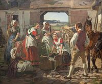 Op het portret staan vrouwen die aan de oogst van het land werken op een boerderij. Op de achtergrond, door de deur van de schuur, het heuvellandschap. De boer en twee paarden kijken toe bij de arbeid, landarbeid.
