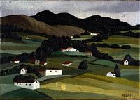 Landschap met woningen tussen de heuvels.