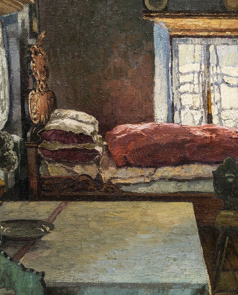 Een interieur van een slaapkamer in waarschijnlijk een boerderij in Oostenrijk. Een bed staat voor het raam met verder kunst aan de muur en een tafel met stoel op de vloer van hout.