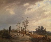 Een herder is op weg met een kudde geiten door een landschap naar huis terwijl een storm op komst is en de lucht met donkere wolken dreigt.