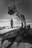 Een zwart-wit foto van een Jeneverbesboom en een kegelvormige rots bij Jumbo Rocks in Joshua Tree National Park, California, zuidwesten van de Verenigde Staten.