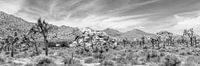 Joshua Tree National Park ligt in het zuidoosten van Californië. Het park is vernoemd naar de Joshua-palmlelies, ook wel Joshua-bomen genoemd, die tot de yuccafamilie behoren. Ze kenmerken het kale landschap. Prachtig panoramisch uitzicht vanuit het hart van het Joshua Tree National Park.
