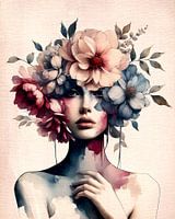 Een portretkunstwerk genaamd Josy's flower fantasy uitgevoerd in pastelkleuren roze, geel, groen, koper, brons, turquoise, bruin, zwart, beige, ivoor waardoor een prachtig kleurenschema ontstaat. Moderne fantasie kunst.