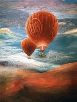 Surrealistisch schilderij met lucht balonnen in voornamelijk oranje en steen rode tinten. Abstracte mixed media kunst.