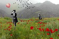 Verschillende foto's met elkaar gecombineerd om zo tot een vrolijk en surrealistisch beeld te komen.